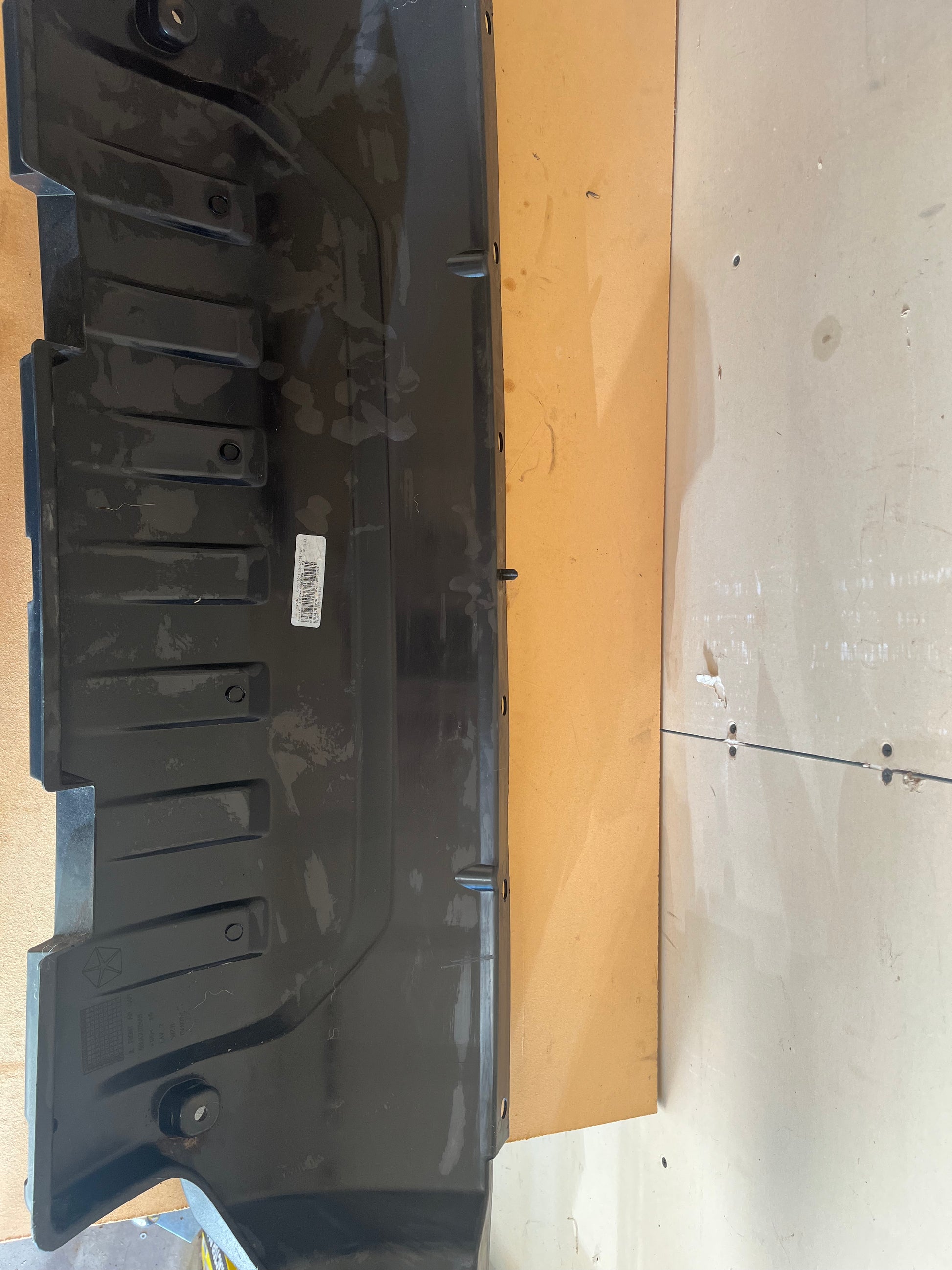 OEM front splash shield / skid plate removed from a 2021 Jeep Wrangler JL Unlimited 3.0L EcoDiesel. This factory panel mounts underneath the front of the Jeep and protects the engine bay from water, mud, road debris, and rocks.
