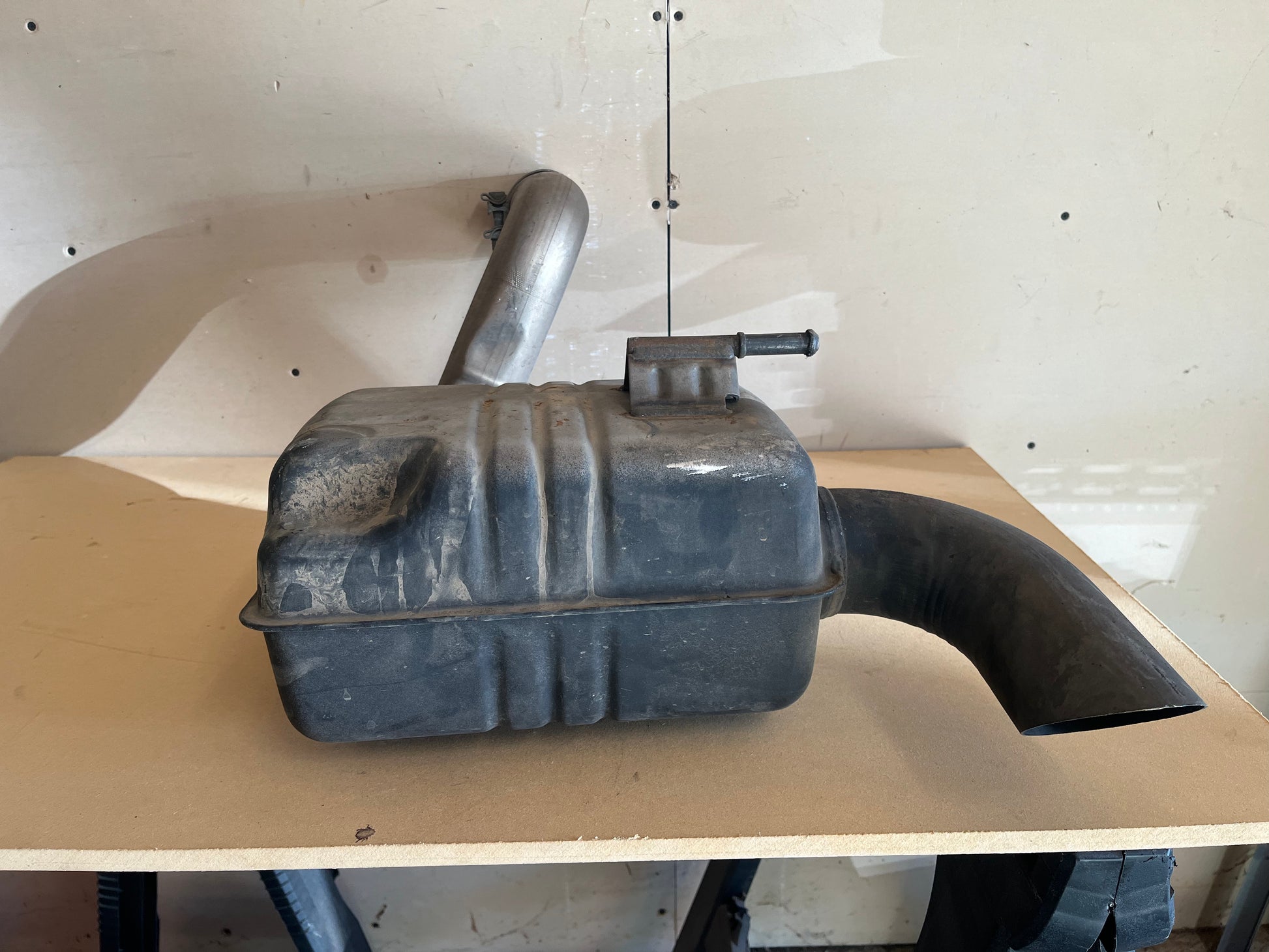 OEM factory rear muffler removed from a 2021 Jeep Wrangler JLU EcoDiesel equipped with the 3.0L V6 diesel engine.