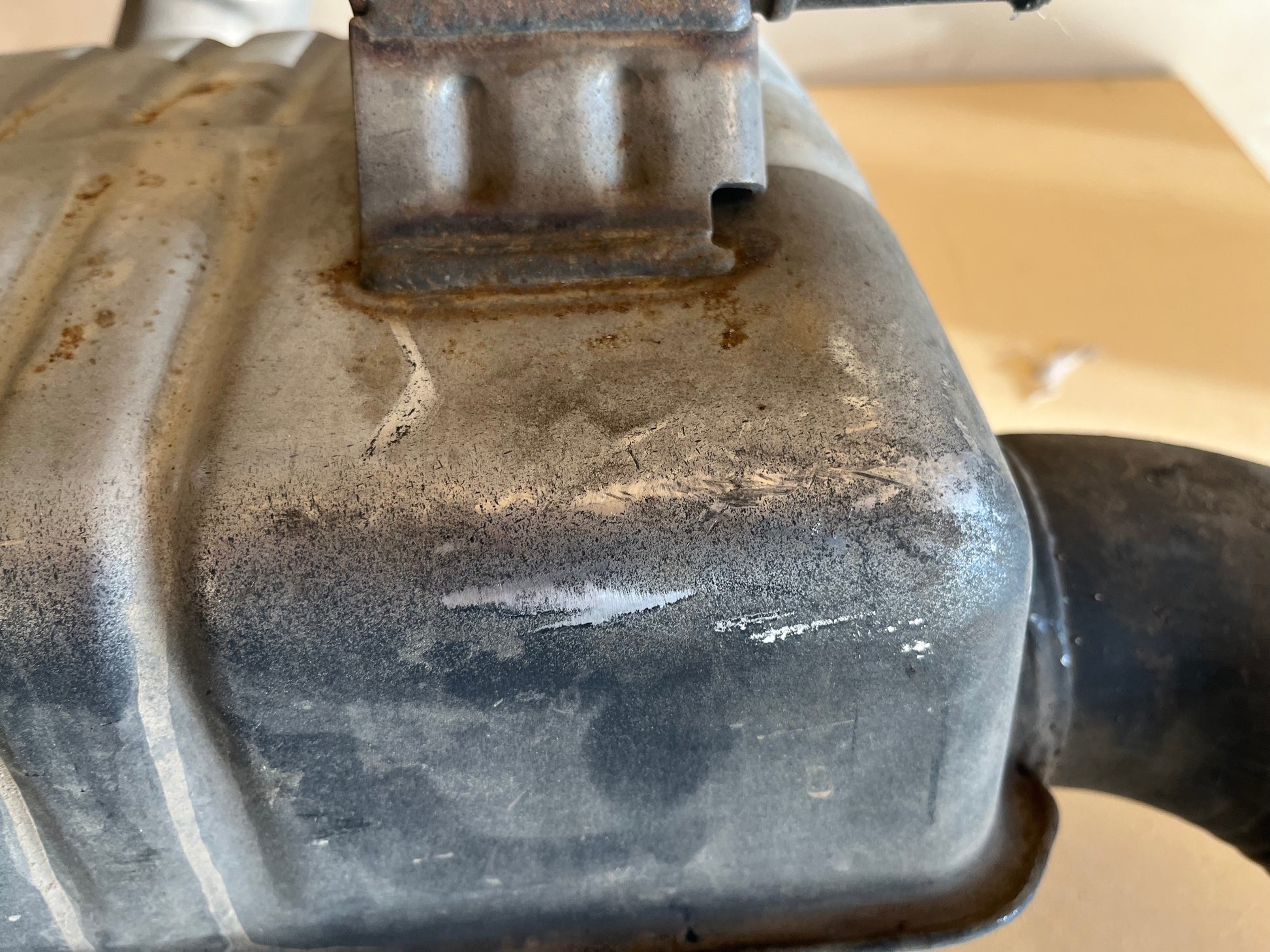 The muffler is in good used condition with normal surface oxidation and road grime consistent with mileage. No cracks, holes, dents, or structural damage. Pipes are straight with no crush points. All factory mounting brackets and hangers are intact and solid.